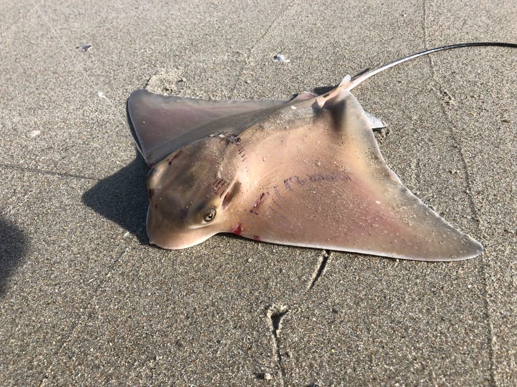 The Southern Eagle Ray has a blunt snout and eyes on the sides of the head. The disc is wider than long and has pointed tips. There is a small dorsal fin followed by a venomous stinging spine on the long whip-like tail.